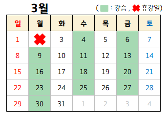 - 월 12회 수업 [ 3/2(월)대체공휴일 : 휴강일 ]