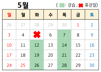 - 월 7회 수업 [ 5/1(금)노동절, 5/5(화)어린이날, 5/25(월)대체공휴일: 휴강일 ]